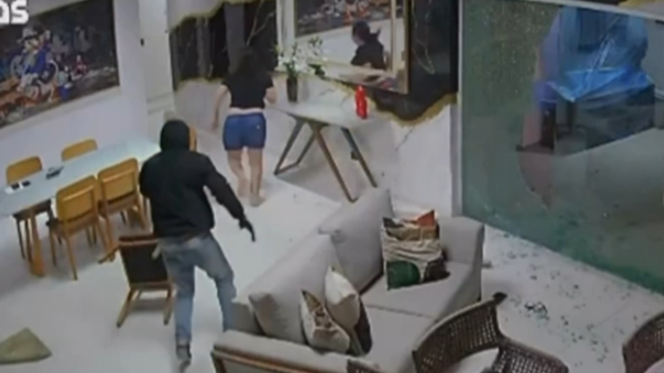 Pelas imagens, é possível ver o momento em que um homem, utilizando roupas pretas, surpreende Gabriela com diversos tiros. A mulher cai no chão e tenta se proteger atrás de um sofá enquanto o homem atira.